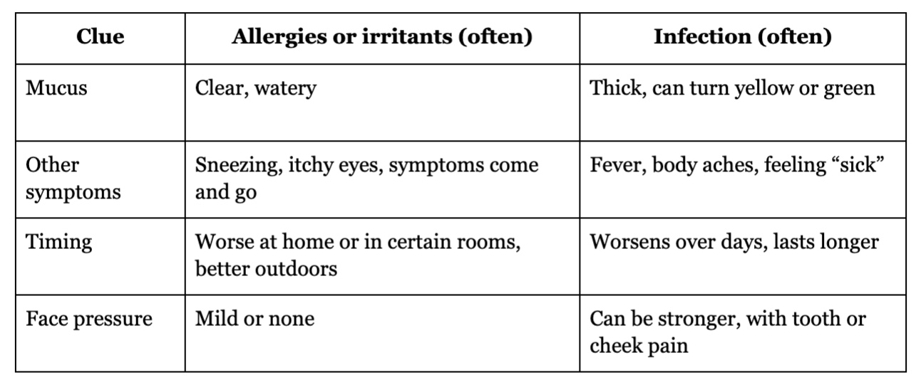 It can look like allergies, but it often lacks the classic itchiness. People may have congestion and a drip without itchy eyes.